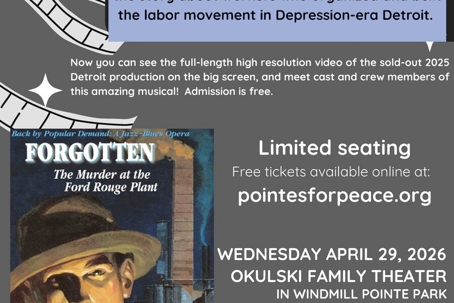 Event Description:"Forgotten" the acclaimed jazz opera that tells the story of workers who organized and built the labor movement in Depression-era Detroit. This screening will be of the sold-out 2025 Detroit production of the musical and there will be a chance to meet cast and crew members of the musical. Admission to this Movie Night is free but registration is required.