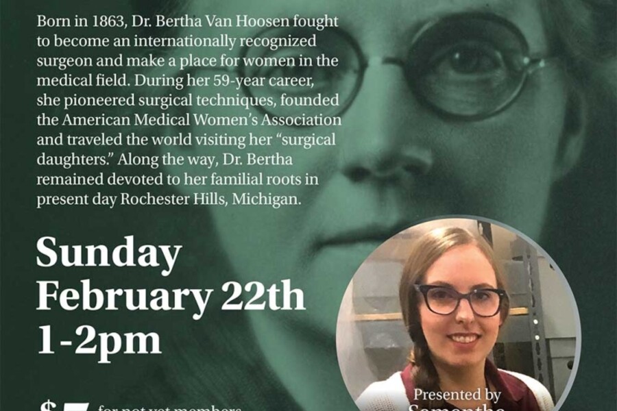 Event Description:The Packard Proving Grounds continues its Historical Speaker Series with “The Life of Dr. Bertha Van Hoosen.” This lecture presented by Samantha Lawrence will focus on the 59-year career of Dr. Van Hoosen who pioneered surgical techniques and founded the American Medical Women’s Association. Lectures at PPG are free for members and $5 for all others.