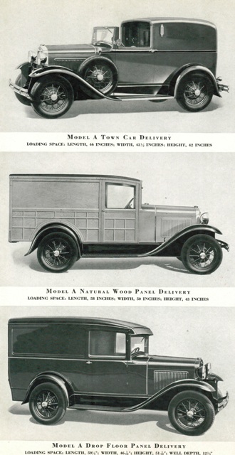 Ford's second model that was released for the commercial market was the Ford Delivery Van introduced in 1907. Later, the very popular Model T Ford was easily modified for commercial purposes. During the 1930's, the De Luxe Delivery models at Ford offered a low cost price tag for the consumers throughout America. By the early 1930's, an open cab pickup truck became a popular vehicle among many companies who were fans of Ford’s lines of great trucks. Other popular models included the Model A Town Car Delivery which offered an aluminum body with Veneer panels and full length sliding doors that connected the driver's compartment with the loading area for the driver’s work usage. Ford also offered a Model A natural wood panel delivery truck which was also very popular. The model offered hard maple and birch material finished in natural grain wood products. The sides and rear were painted and the seats were deeply cushioned. Ford also offered the Ford drop floor panel delivery that was designed for florists, cleaners, or sales men with their samples. The drop floor was the same construction as the body floor and the wide double doors made it easier for retailers and their working needs.
