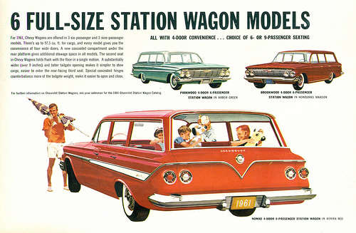 Chevrolet offered 20 new models, which was an increase of two over the 1960 model lineup. The model changes were reflected in the Impala Series and the Station Wagon Series. A new Impala two-door sedan was added and a total of six 4-door station wagons which included three 6-passenger and three 9-passenger models. The models that were offered in the series were the Impala, Bel Air, Biscayne, Fleetmaster and the popular station wagon models. New front pillars of all Chevrolet passenger cars gave a totally new appearance to the windshield and ventiports. In addition, the Impala Convertible offered a compound curved windshield. All Impala models, with the exception of the convertible, had a bright simulated exhaust port at the base of the rear window. The triple light arrangement on the Impala models featured two tail lights separated by a back-up light. Both tail lights included stop and direction signals. A new sculpted rear deck treatment had extended to station wagon models. The Chevrolet nameplate in block letters provided identification on the tailgate. The power-operated tailgate window was standard equipment on the 9-passenger models and available as an accessory on 6-passenger station wagon models.